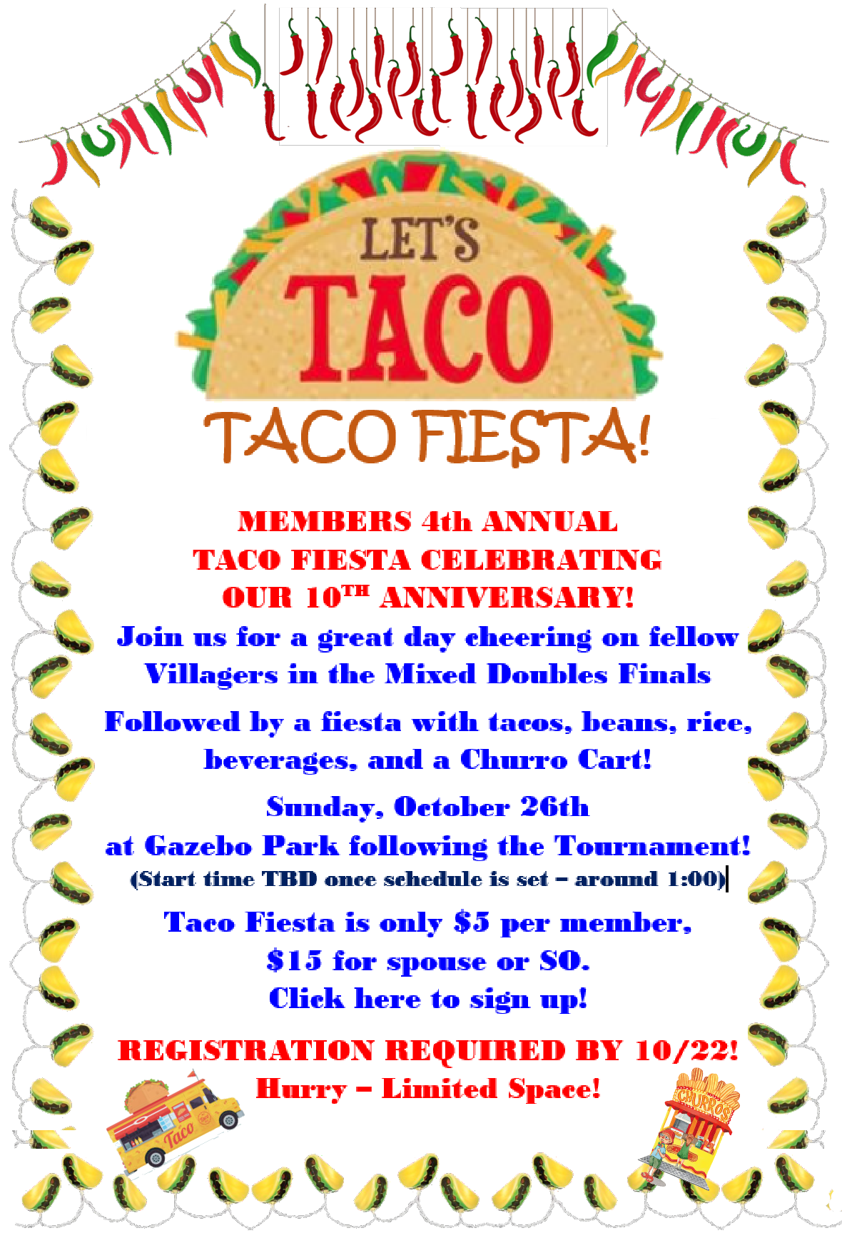 You’ll never find a deal as good as this! For $5.00 you’ve got tacos, a churro truck, and a lot of fun! Come and celebrate our TENTH anniversary on Sunday, October 26th! This is a give-back to our members – our way of saying thank you for the good times over the last decade… growing from a club of 20 to over 650 players! Click here or on the graphic below to sign up!